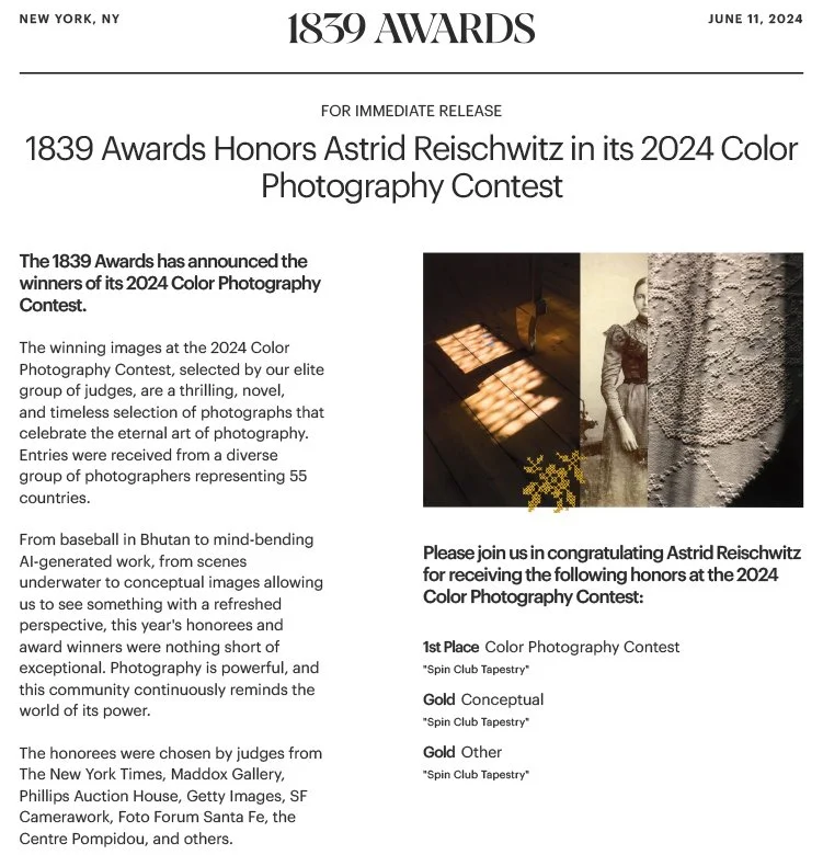 My monograph Spin Cub Stories received a Silver placement in the 2023 PX3 | Prix de la Photography de Paris. Spin Club Stories is inspired by the old tradition of spin clubs in my village in Northern Germany, where village women met to spin wool and create needlework - and share stories while they worked. I transform this tradition of storytelling into a visual journey and explore personal and cultural memory, tradition, and identity.